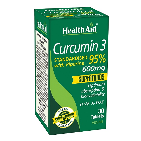 Το Curcumin 3 της HealthAid είναι τιτλοδοτημένο εκχύλισμα κουρκουμά, το οποίο περίεχει σε 95% τα 3 κύρια κουρκουμινοειδή – Curcumin, Demethoxycurcumin, Bisdemethoxycurcumin – , μαζί με πιπερίνη για μέγιστη απορρόφηση και βιοδιαθεσιμότητα.